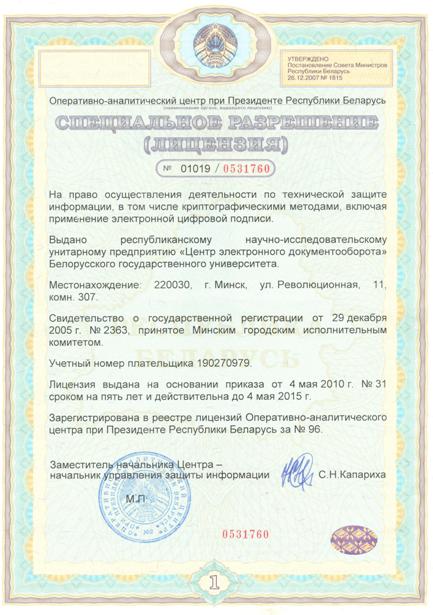«Центру электронного документооборота» выдано специальное разрешение (лицензия) на право осуществления деятельности по технической защите информации, в том числе криптографическими методами, включая применение электронной цифровой подписи.