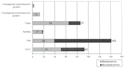В учреждениях центрального и регионального уровней ЭЦП используется повсеместно. В учреждениях местного уровня применение ЭЦП отмечают 51% респондентов. Из них: в районных судах – в 76%, в областных и зональных архивах – 95%, ГНК – 28%, отделах ЗАГС – 55%.