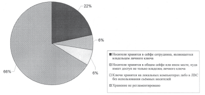 В учреждениях, где применяется ЭЦП, в большинстве случаев (66%) хранение ключей ЭЦП никак не регламентировано. В 22% случаев хранение осуществляется в сейфе владельца личного ключа, в 6% случаев – в общем сейфе или ином месте, доступ к которому имеет несколько сотрудников, и в 6% ключи хранятся без использования съемных носителей на локальных компьютерах пользователей либо в локальной вычислительной сети. Таким образом, только в 22% организаций хранение ключей ЭЦП организовано правильно (см. диаграмму).