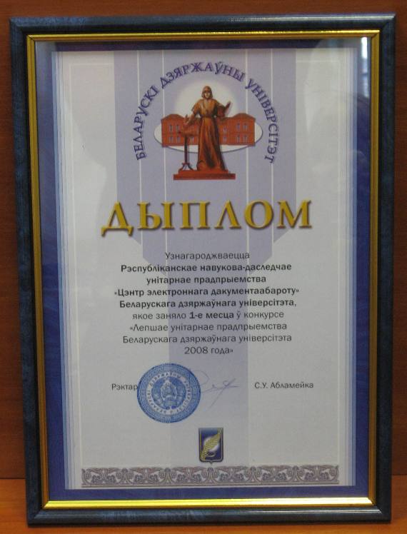 РУП «Центр электронного документооборота» получило первое место в конкурсе «Лучшее унитарное предприятие Белорусского государственного университета 2008 года».